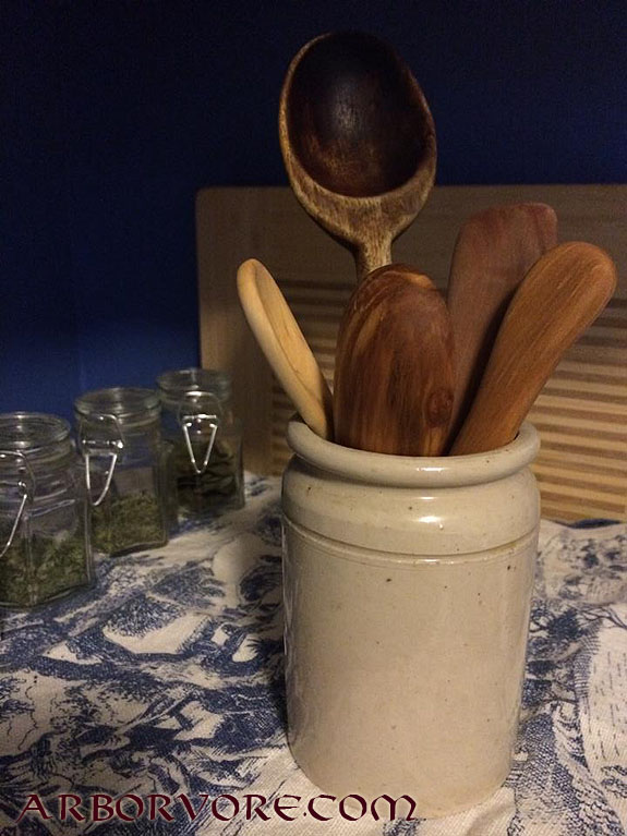 The photograph above shows a little crock of wooden utensils I keep close to the stove. In the back is my all-time favorite wooden spoon, and the only purchased one in the lot. It is worn, dented, burned and battered, but it is still my favorite cooking tool. I doubt anyone would develop this kind of attachment to a silicone spatula or a plastic spoon, and I’m certain that if I had purchased one of those for my first apartment that it would be long gone by now.
